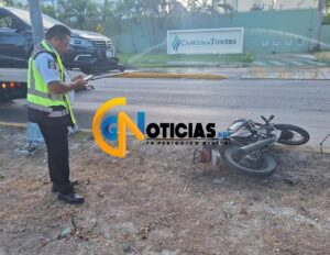 Según curiosos el conductor de un caballito de acero de la marca Italika perdió el control y se estampó contra el camellón central dejando a sus pasajeros lesionados frente al edificio Cancún Tower.