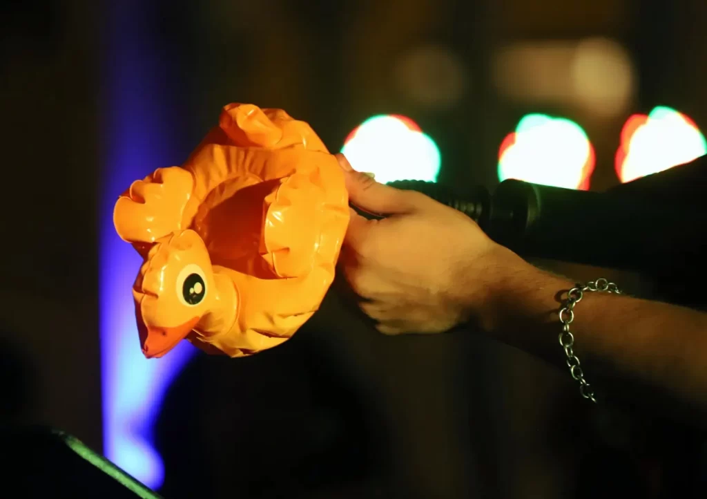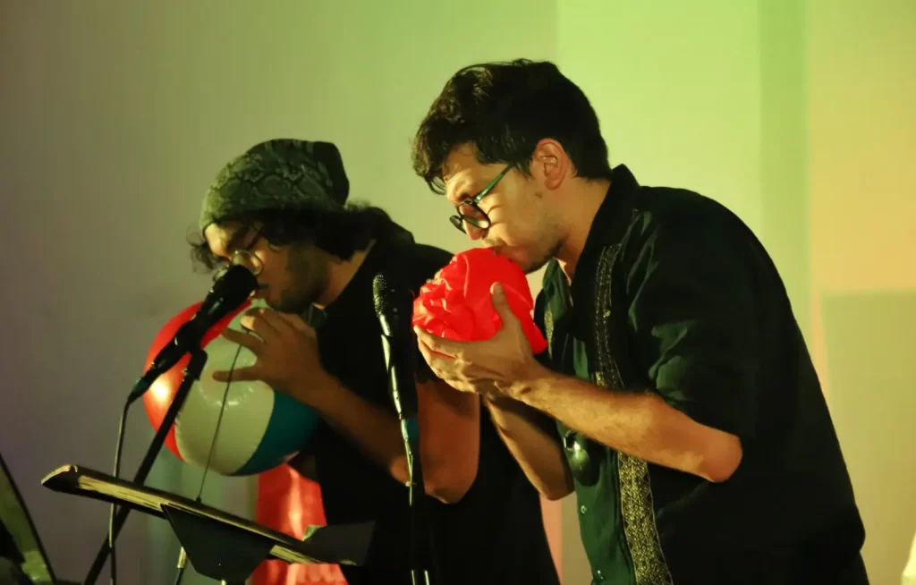 La pieza contó con la participación de cinco intérpretes que manipularon salvavidas, pelotas y flotadores, siguiendo una partitura guiada por el aliento, el ritmo y la gestualidad. La propuesta evocó la relación entre memoria, cuerpo y sonido, replanteando la música como una experiencia afectiva y sensorial.