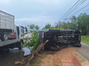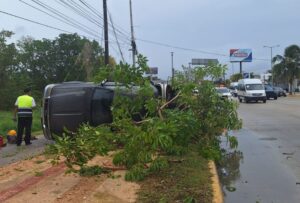 Cancún .- El conductor de una camioneta resultó bien librado luego de que por conducir a exceso de velocidad y no tomar en cuenta en asfalto mojado, perdió el control y se volcó sobre el bulevar Luis Donaldo Colosio.