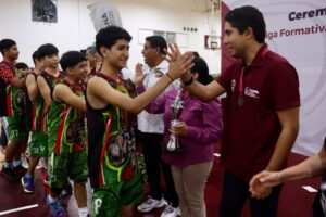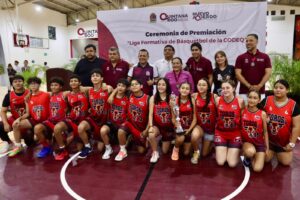 Chetumal.- En medio de una colorida ceremonia, ambientada por entusiastas niñas, niños y jóvenes en el renovado Gimnasio “Nohoch Suku’n”, se realizó con éxito la premiación de la Liga Formativa de Básquetbol de la CODEQ, un espacio en el que compiten alrededor de 350 jugadores y que estuvo encabezado por Elda Xix Euán, secretaria de Educación en Quintana Roo y Jacobo Arzate Hop, presidente de la Comisión del Deporte de Quintana Roo (CODEQ).