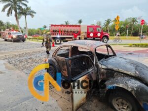 Cancún, Q. Roo, 26 de junio de 2025 — La Dirección General del Heroico Cuerpo de Bomberos atendió este miércoles por la noche el incendio de un vehículo en la entrada de Puerto Cancún, sobre la avenida Bonampak.