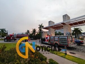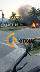 Cancún, Q. Roo, 26 de junio de 2025 — La Dirección General del Heroico Cuerpo de Bomberos atendió este miércoles por la noche el incendio de un vehículo en la entrada de Puerto Cancún, sobre la avenida Bonampak.