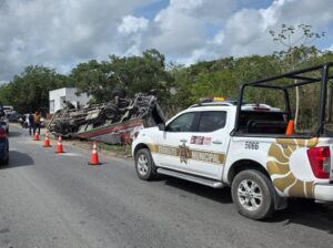 Cancún. – Se registró un aparatoso accidente este lunes, sobre la carretera Gas Auto, donde por una falla mecánica el operador de un camión, tipo caja, chocó con otra unidad y terminó volcado. No se reportaron lesionados.