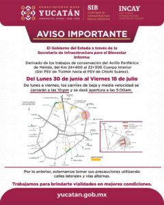 Como parte del mismo programa de mantenimiento vial, el Incay anunció que continuará con trabajos en el cuerpo interior del periférico, del kilómetro 24+400 al 22+300, es decir, desde el PSV de Tizimín hasta el PSV de Chichí Suárez.