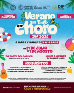 Playa del Carmen, Quintana Roo, 8 de julio de 2025. – Con el objetivo de ofrecer a niñas y niños un espacio seguro, divertido y formativo durante las vacaciones, el Gobierno Municipal de Playa del Carmen, encabezado por Estefanía Mercado, a través del Sistema DIF Municipal presidido honoríficamente por Eduardo Asencio, invita al curso de verano “Verano sin tanto choro”, un programa gratuito dirigido a menores de entre 6 y 13 años.