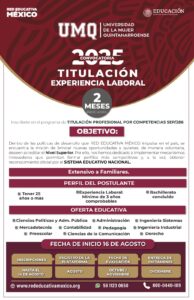 En calidad de Presidenta Honoraria de la UMQ, la Mtra. Jimena Lasa y Red Educativa México anuncian que los Programas académicos en línea de la Universidad ofrecerán 1000 becas educativas del 50% a todas aquellas mujeres que cuenten con residencia en el Estado de Quintana Roo; y que cumplan con los requisitos del programa de estudios.