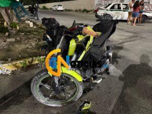 Cancún.- Un motoneto destruye su caballito de acero al estamparse contra un taxi en la región 248