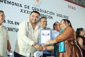 Kantunilkín. 17 de Julio del 2025.-Un total de 144 alumnos del Centro de Bachillerato Tecnológico Agropecuario (CBTA) 186 de esta ciudad concluyeron sus estudios de nivel medio superior recibiendo sus documentos de manos del presidente municipal Nivardo Mena quien asistió como invitado especial a la ceremonia de graduación.