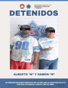 Cancún, Q. Roo., a 28 de julio de 2025. – Elementos de la Secretaría Municipal de Seguridad Ciudadana y Tránsito (SMSCyT) de Benito Juárez detuvieron a Alberto “N”, de 41 años de edad y Ramón “N”, de 44 años, por presunta desobediencia y resistencia de particulares.