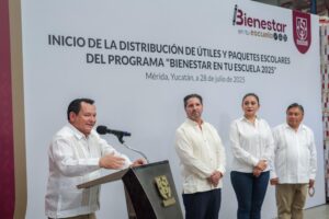 Durante el evento, la secretaria de Bienestar, Fátima Perera Salazar, mostró al Gobernador y demás autoridades el contenido de los paquetes escolares, los cuales serán distribuidos en los próximos días a través de 14 rutas en el interior del estado y cinco en Mérida.