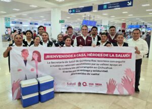 Cancún.- Autoridades de la Secretaría Estatal de Salud, dieron la bienvenida y reconocieron el compromiso del grupo de 10 vacunadoras y vacunadores quintanarroenses que participaron en la estrategia de vacunación implementada en el estado de Chihuahua, como parte de las acciones para mantener bajo control la propagación del sarampión en el país.