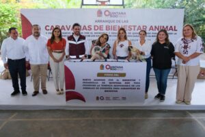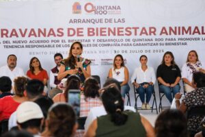 Cancún.– Para el bienestar, protección y calidad de vida de los animales de compañía, la gobernadora Mara Lezama Espinosa, junto con el secretario de Ecología y Medio Ambiente, Óscar Rébora Aguilera, encabezó el arranque de las Caravanas de Bienestar Animal durante un evento realizado en el domo de la colonia Vicente Guerrero, en Alfredo V. Bonfil, municipio de Benito Juárez.