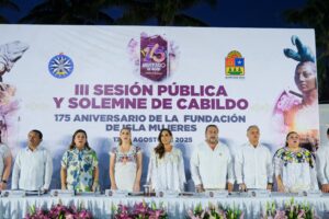 Isla Mujeres.- En el marco de la III Sesión Pública y Solemne por el 175 aniversario de la Fundación de Isla Mujeres, la gobernadora Mara Lezama Espinosa afirmó que en esta fecha se celebra la fuerza que distingue a las y los isleños, la vida de un pueblo que nunca se rinde y que siempre abre los brazos al mundo con calidez.