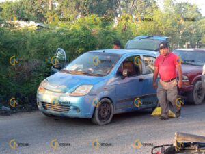 Cancún.- Un imprudente conductor por evitar el tráfico y rebasar en zona prohibida provocó que impactará a una motociclista que iba a su trabajo, en el Arco Vial.