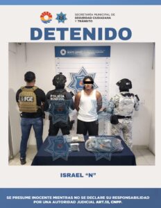 Cancún, Q. Roo., a 29 de agosto de 2025.-En el marco del operativo “Blindaje Cancún”, la Secretaría Municipal de Seguridad Ciudadana y Tránsito (SMSCyT) de Benito Juárez, en coordinación con la Guardia Nacional y la Fiscalía General del Estado, logró la detención de un individuo presuntamente relacionado con delitos contra la salud en su modalidad de narcomenudeo.