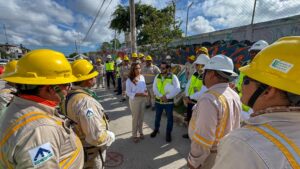 Cancún.- La gobernadora Mara Lezama Espinosa supervisó los trabajos de restauración del suministro de energía eléctrica en la zona de la avenida Huayacán con Kabah y Las Torres de esta ciudad, donde personal de la Comisión Federal de Electricidad (CFE) trabaja en la instalación de nuevos circuitos eléctricos que eviten la sobrecarga y garanticen el suministro las 24 horas.