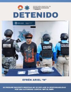 Cancún, Q. Roo., a 03 de septiembre de 2025.– En una acción coordinada entre la Guardia Nacional y la Policía Turística de la Secretaría Municipal de Seguridad Ciudadana y Tránsito (SMSCyT) de Benito Juárez, fue detenido un hombre por su presunta participación en delitos contra la salud, en la modalidad de narcomenudeo.