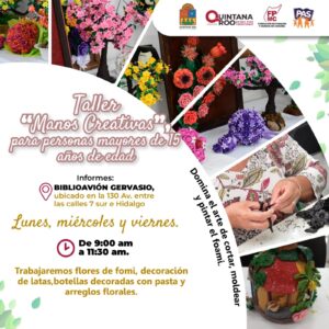 Cozumel.- La Fundación de Parques y Museos de Cozumel (FPMC) invita a personas mayores de 15 años a inscribirse al taller gratuito “Manos Creativas”, que se impartirá los días lunes, miércoles y viernes de 09:00 a 11:30 horas en el BiblioAvión Gervasio.