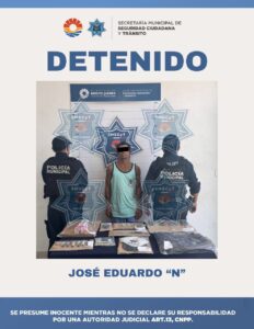 Cancún, Q. Roo., a 8 de septiembre de 2025.– Elementos de la Secretaría Municipal de Seguridad Ciudadana y Tránsito (SMSCyT) de Benito Juárez detuvieron a José Eduardo “N”, de 38 años de edad, por su probable participación en el delito de robo a comercio.