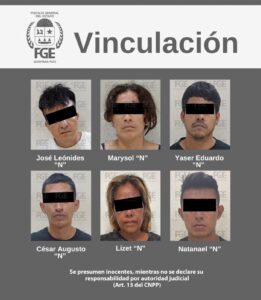 • La Fiscalía General del Estado informa que los ahora imputados son identificados como José Leónides “N”, Marysol “N”, César Augusto “N”, Yaser Eduardo “N”, Natanael “N” y Lizet “N”