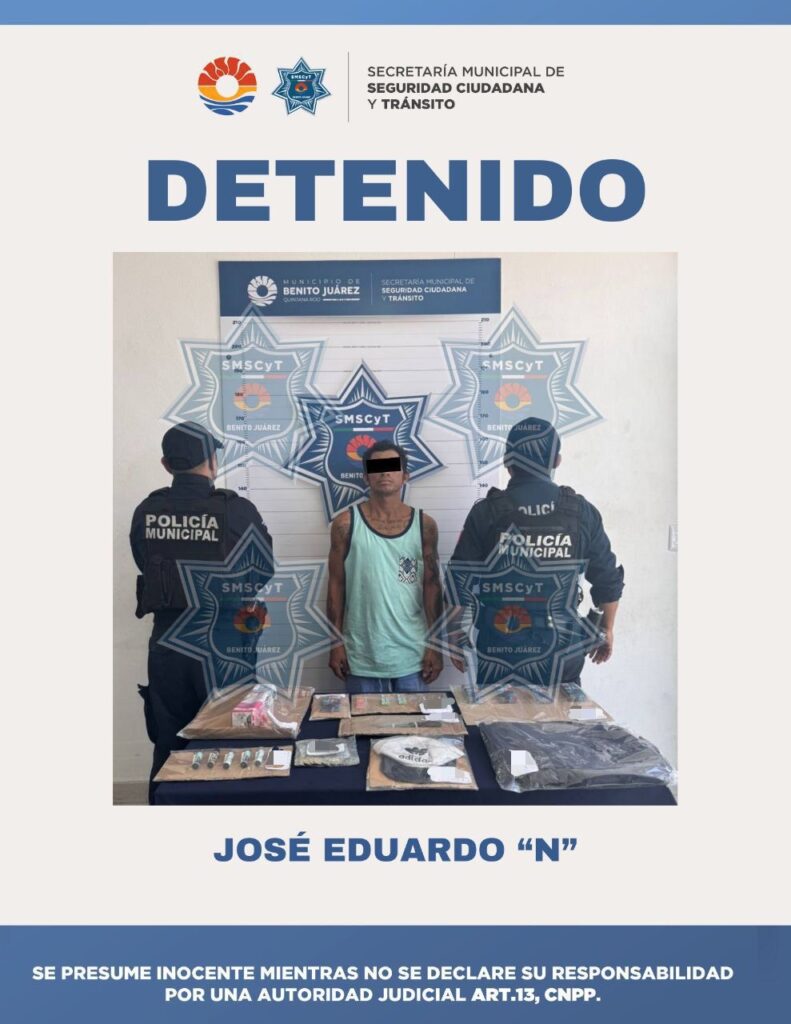 Cancún, Q. Roo., a 8 de septiembre de 2025.– Elementos de la Secretaría Municipal de Seguridad Ciudadana y Tránsito (SMSCyT) de Benito Juárez detuvieron a José Eduardo “N”, de 38 años de edad, por su probable participación en el delito de robo a comercio. Los hechos ocurrieron durante recorridos de prevención y vigilancia en las […]