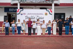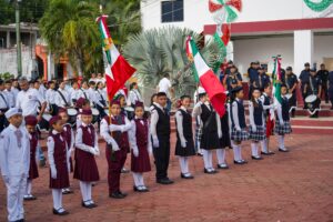 Ya en la explanada del palacio municipal, Nivardo Mena presenció la participación de las escuelas de todos los niveles educativos desde conafe, inicial, preescolar, primarias, secundaria, nivel medio superior y superior que se sumaron a los festejos patrios.