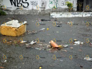 Cancún. – Como ya es una costumbre los alrededores del antiguo hospital se convierte en un verdadero oasis, pero de basura y el agua hace su chamba.