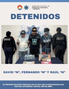 Cancún, Q. Roo., 26 de septiembre de 2025.– Elementos de la Secretaría Municipal de Seguridad Ciudadana y Tránsito (SMSCyT) de Benito Juárez detuvieron a David “N”, de 22 años; Fernando “N”, de 23, y Raúl “N”, de 38, por su presunta participación en el delito de robo.