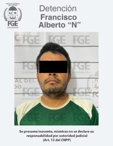 Othón P. Blanco.- Tras solicitar y obtener de un Juez de Control, la orden de aprehensión correspondiente, personal de la Fiscalía General del Estado, procedió a cumplimentarla en la persona de quien es identificado como Francisco Alberto “N”, por su presunta participación en hechos posiblemente constitutivos del delito de feminicidio en agravio de una víctima de identidad reservada, en este municipio.