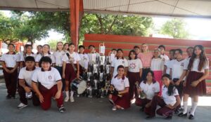 Refrendando su apoyo decidido a las y los jóvenes, Atenea Gómez, también hizo entrega de instrumentos musicales para la Banda de Guerra de la Técnica #1, en beneficio de más de 540 estudiantes.