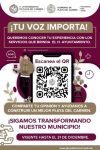 Playa del Carmen, Quintana Roo, 23 de octubre de 2025.- Con el propósito de conocer de primera mano la percepción ciudadana sobre los servicios que administra el gobierno que encabeza la presidenta municipal Estefanía Mercado, la Secretaría de Planeación y Evaluación puso en marcha una serie de encuestas ciudadanas que estarán vigentes hasta el 31 de diciembre.