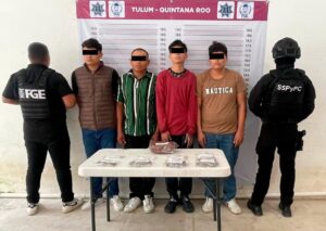 En la avenida Tulum, entre las calles Orión Norte y Beta Norte, del municipio de Tulum, fueron detenidos José Eduardo “N”, Marco Antonio “N”, Emanuel “N” y Jhosef Farid “N”, cuando los sorprendieron intercambiando bolsitas que contenían hierba verde y seca similar a la marihuana y sustancia cristalina parecida a la droga conocida como cristal.