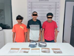 Por último, en el municipio de Cozumel, Juan Carlos “N”, Brayan Esteban “N” y Weslyn Alexander “N”, fueron detenidos en el estacionamiento de una tienda de autoservicio ubicada en la 30 Avenida entre las calles 6 Norte y 8 Norte de la colonia 10 de abril, donde intercambiaban bolsitas que contenían vegetal verde y seco parecido a la marihuana y fragmento sólido cristalino similar a la droga conocida como cristal.