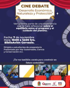 Cozumel.- La Fundación de Parques y Museos de Cozumel (FPMC), en coordinación con la asociación civil “Manglares Más Vivos, Más Sanos”, convoca a estudiantes de nivel bachillerato a participar en las jornadas de Cine Debate tituladas “Desarrollo Económico, Naturale|za y Protección”, que se realizarán los viernes 7 y 21 de noviembre, a las 10:00 horas, en el BiblioAvión Gervasio.