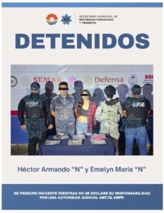 Por lo anterior, Héctor Armando “N” y Emelyn María “N” fueron detenidos y puestos a disposición de la Fiscalía General del Estado para los trámites legales correspondientes.