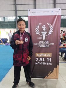 Finalmente, el tercer metal de la jornada, la cual fue de bronce, la obtuvo Axel Fernando Aquino Méndez, quien quedó en tercer puesto nacional en la prueba de Formas con Arma Corta, en la categoría 10-12 años.