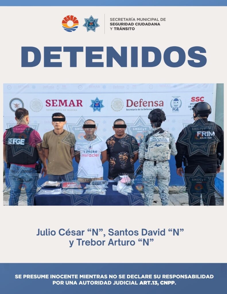 Cancún, Q. Roo., 7 de noviembre de 2025. – En una acción coordinada con la Fiscalía General del Estado (FGE) y autoridades federales, la Secretaría Municipal de Seguridad Ciudadana y Tránsito (SMSCyT) logró la detención de tres hombres por su presunta participación en delitos contra la salud, en su modalidad de narcomenudeo. Durante recorridos de […]