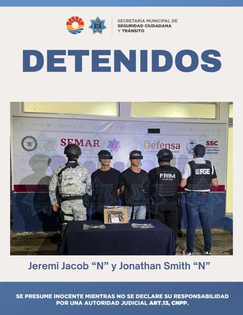 Cancún, Q. Roo., 10 de noviembre de 2025. – En una acción coordinada entre la Fiscalía General del Estado (FGE), autoridades federales y la Secretaría Municipal de Seguridad Ciudadana y Tránsito (SMSCyT), se logró la detención de dos sujetos por su probable participación en el delito de robo con violencia. Durante recorridos de prevención y […]