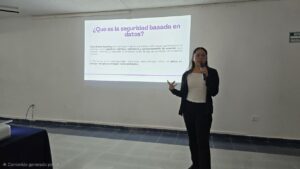 Durante la ponencia, explicó que la Seguridad Basada en Datos convierte la información que generan los sistemas —como registros, telemetría y patrones de comportamiento— en inteligencia predictiva, lo que permite a las organizaciones pasar de la intuición al conocimiento y tomar decisiones informadas.
