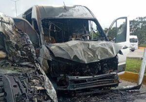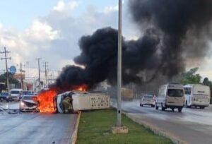 Cancún.– Un aparatoso accidente ocurrido sobre el bulevar Colosio, a la altura del tramo entre Campestre y Bonfil, con dirección al aeropuerto, dejó como saldo un conductor lesionado y dos vehículos incendiados.