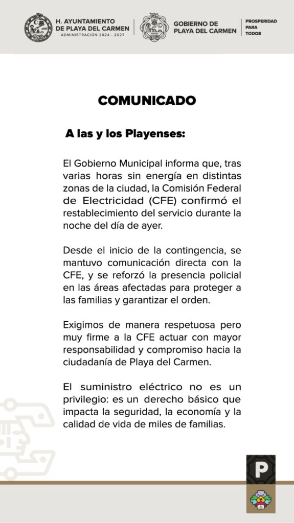 Playa del Carmen, Quintana Roo. 22 de mayo de 2025.-El Gobierno Municipal informa que, tras varias horas sin energía en distintas zonas de la ciudad, la Comisión Federal de Electricidad (CFE) confirmó el restablecimiento del servicio durante la noche del día de ayer. Desde el inicio de la contingencia, se mantuvo comunicación directa con la […]