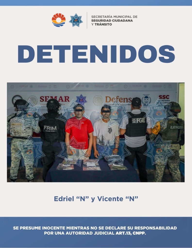 Cancún, Q. Roo., 23 de octubre de 2025. – En una acción conjunta con la Fiscalía General del Estado (FGE) y autoridades federales, la Secretaría Municipal de Seguridad Ciudadana y Tránsito (SMSCyT) de Benito Juárez logró la detención de dos hombres por su presunta participación en delitos contra la salud, en su modalidad de narcomenudeo. […]