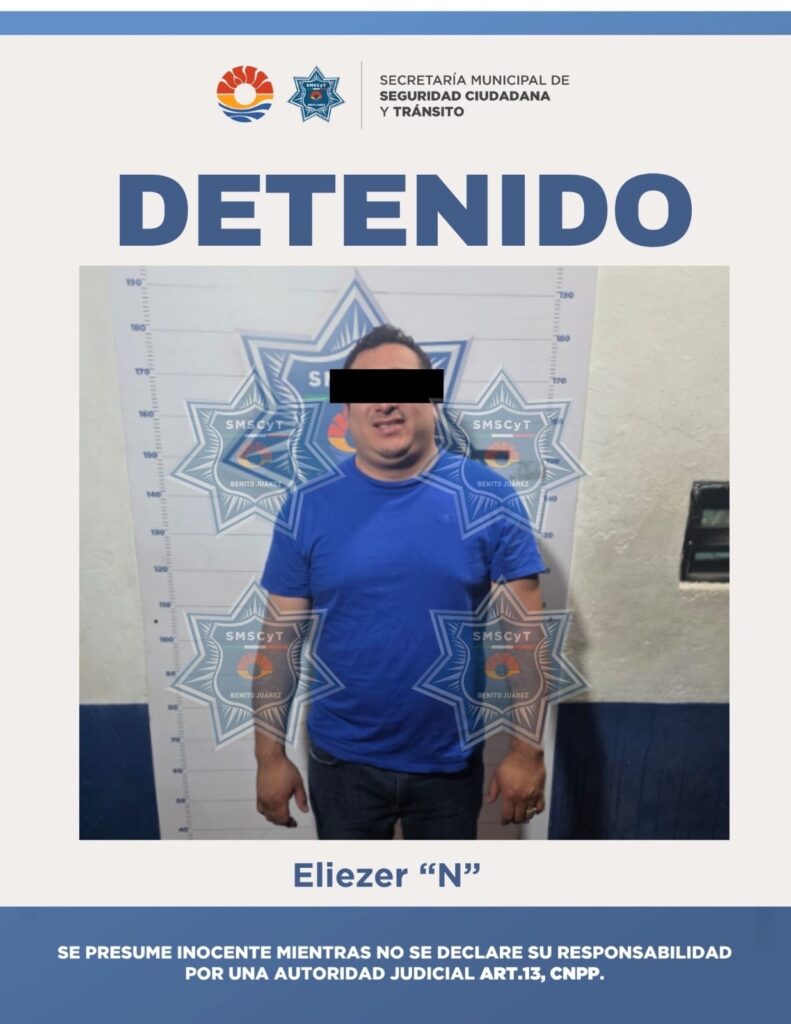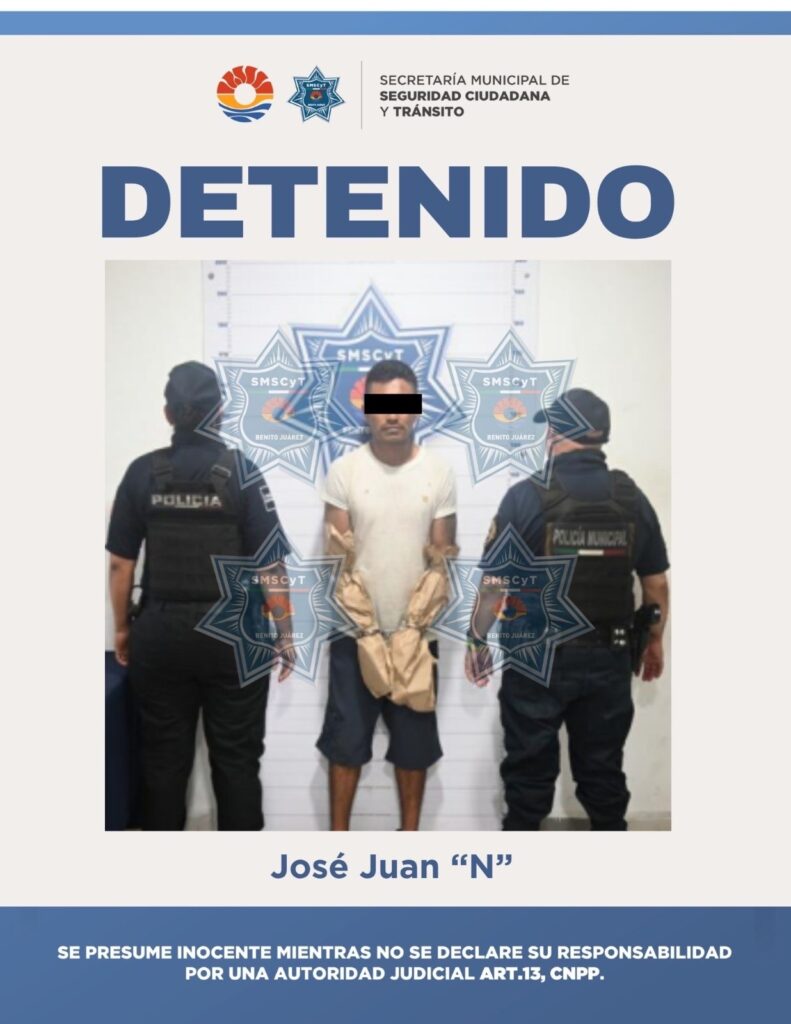 Cancún, Q. Roo., a 23 de octubre de 2025. – Elementos de la Secretaría Municipal de Seguridad Ciudadana y Tránsito (SMSCyT) de Benito Juárez detuvieron a José Juan “N”, de 40 años de edad, por su presunta participación en el delito de robo con violencia en grado de tentativa. Los hechos ocurrieron en la Supermanzana […]