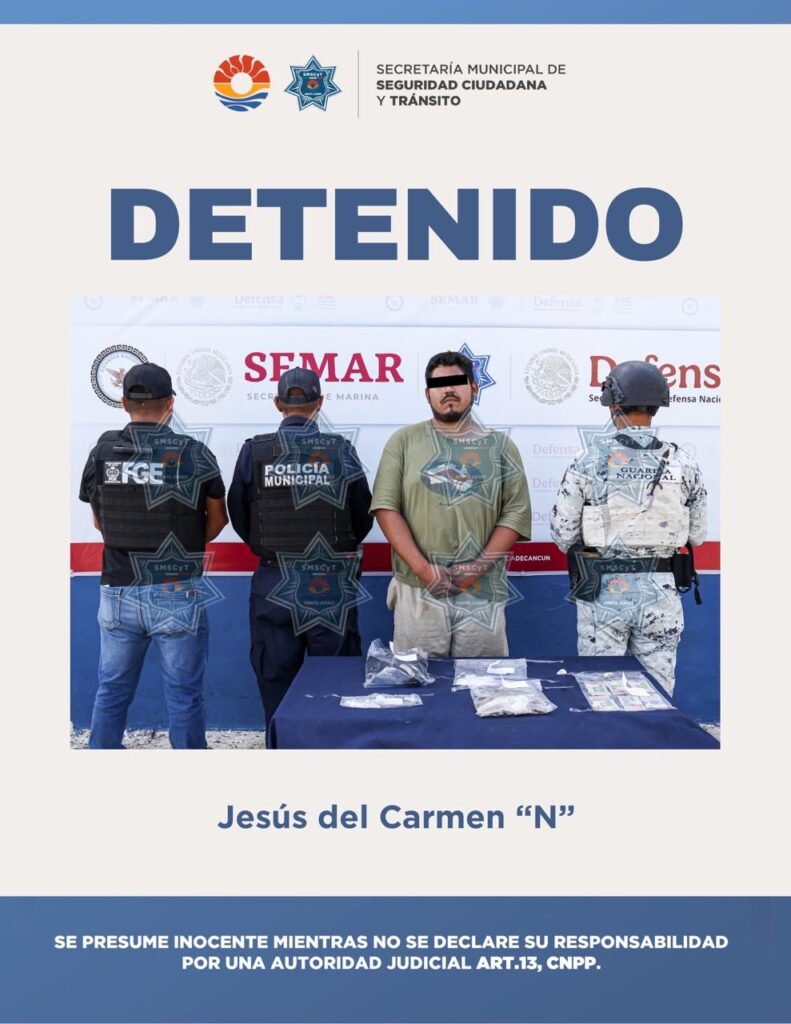 Cancún, Q. Roo., 17 de octubre de 2025. – En una acción coordinada entre la Fiscalía General del Estado y autoridades federales, la Secretaría Municipal de Seguridad Ciudadana y Tránsito (SMSCyT) de Benito Juárez logró la detención de un hombre por su presunta participación en delitos contra la salud, en la modalidad de narcomenudeo. Durante […]