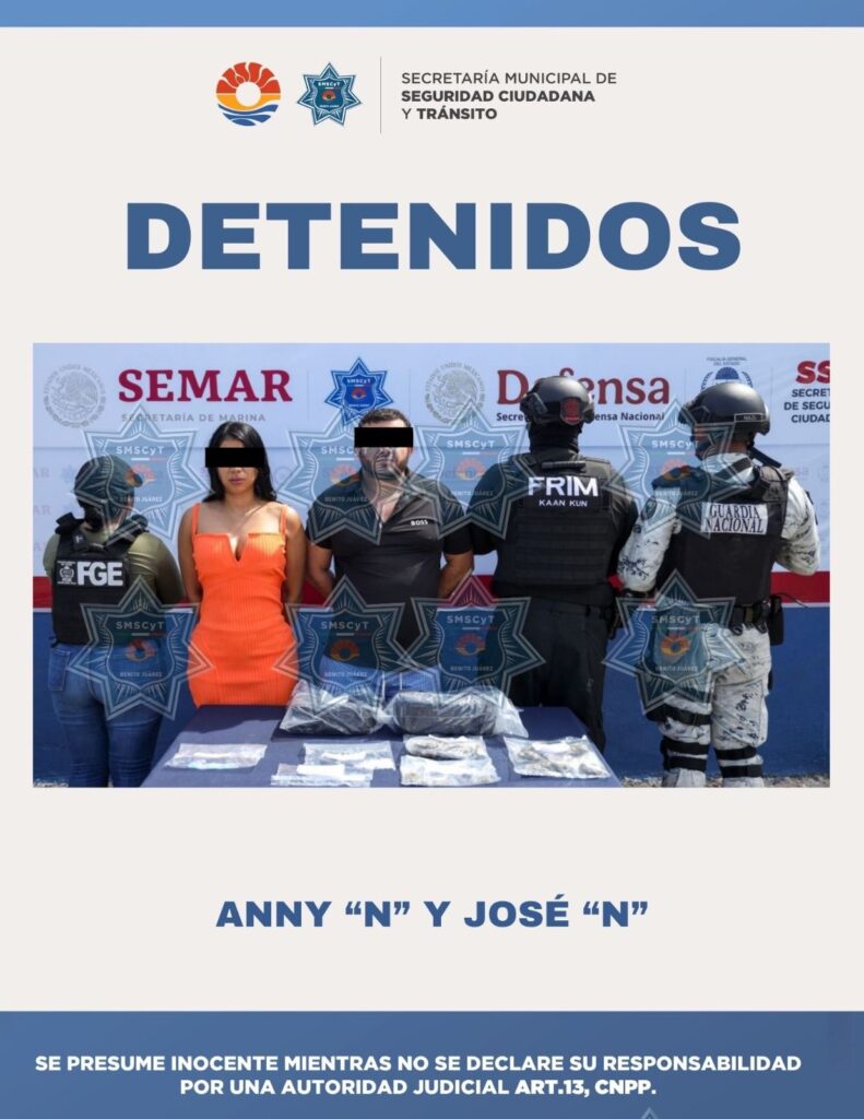Cancún, Q. Roo., 8 de octubre de 2025. – En una acción coordinada entre la Guardia Nacional, la Fiscalía General del Estado (FGE) y la Secretaría Municipal de Seguridad Ciudadana y Tránsito (SMSCyT) de Benito Juárez, fueron detenidos una mujer y un hombre por su presunta participación en delitos contra la salud, en su modalidad […]