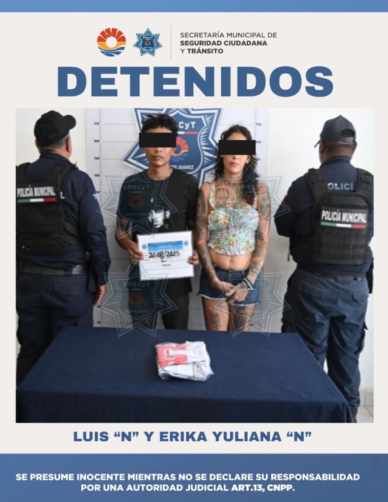 Cancún, Q. Roo., a 27 de agosto de 2025.– Elementos de la Secretaría Municipal de Seguridad Ciudadana y Tránsito (SMSCyT) de Benito Juárez detuvieron a Luis “N”, de 28 años de edad, y Erika Yuliana “N”, de 32 años, presuntos implicados en el delito de quebrantamiento de sellos. Los hechos ocurrieron en las inmediaciones de […]